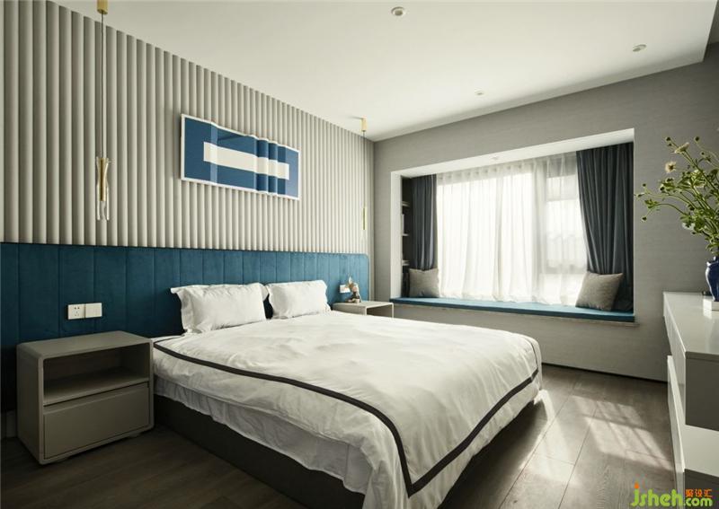 杭州裝修設(shè)計(jì)波浪紋的床頭背景搭配海藍(lán)色床頭靠背,夜晚降臨,如同沉睡在海洋之上,安撫人心,自由自在。