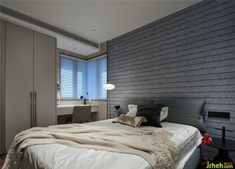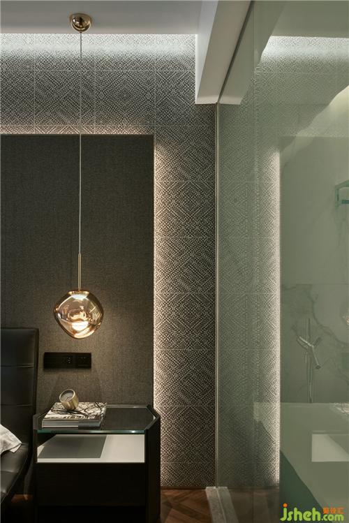 次臥室質(zhì)感強(qiáng)烈的壁紙?jiān)黾恿苏麄€(gè)空間舒適度,個(gè)性的燈具,冷淡中又不失趣味。