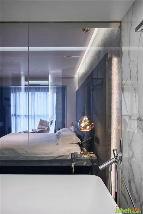 二層主臥內(nèi)不同質(zhì)感材質(zhì)混搭刻畫出肌理、明暗的變化,玻璃材質(zhì)的柜門,通過唯美的規(guī)劃分割,完美實(shí)現(xiàn)功能與美感的結(jié)合,盎然有趣杭州裝修設(shè)計(jì)。