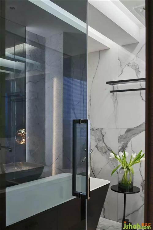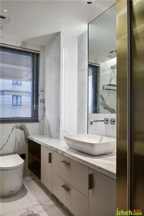 主人衛(wèi)的設(shè)計(jì)時(shí)尚有格調(diào),一體定制的洗手臺,大面積的雪花白大理石,灰玻的運(yùn)用,豐富了空間層次。