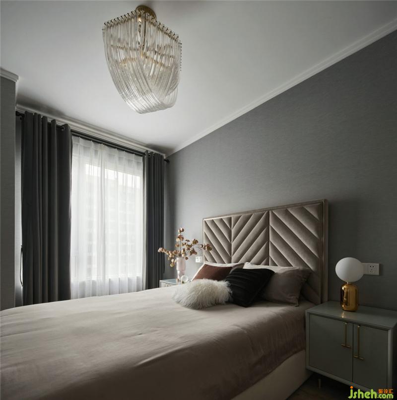 次臥室溫馨細(xì)膩,杭州裝修設(shè)計(jì)充滿動感的床背和流線型的吊燈,配以“枝搖風(fēng)鈴動,花滿自然秋”的復(fù)羽葉欒樹花藝,一派歲月靜好的景象。