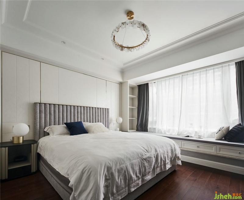 主臥室在保留原硬裝基礎(chǔ)之上,以家具和軟裝配飾充分體現(xiàn)空間的雅致和舒適感,床靠背的紋路呼應(yīng)墻面造型,提升空間的視覺感,飄窗的合理使用,杭州裝修設(shè)計給主人增加了一個放松休閑的好地方。