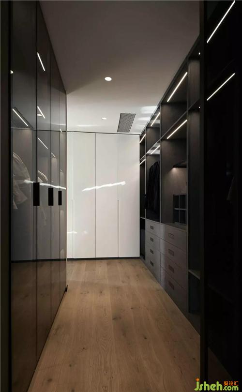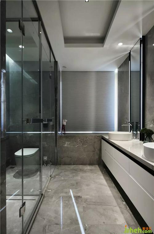 雙人位的洗手臺(tái)面干凈利落,在灰色大理石的映襯下,富有層次和變化。