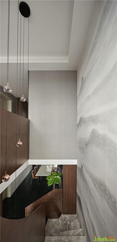 拾階而上,側(cè)面淡墨寫意的山水畫渲染了整個(gè)空間的禪意,垂直而下的水晶球燈和點(diǎn)線面的巧妙結(jié)合,使人身坐此處,迎面一副清泉山澗美如畫的畫卷悠然而來(lái)。