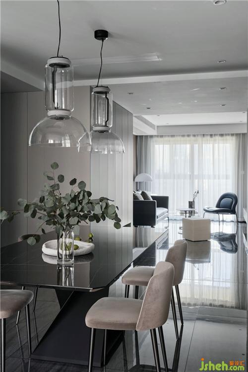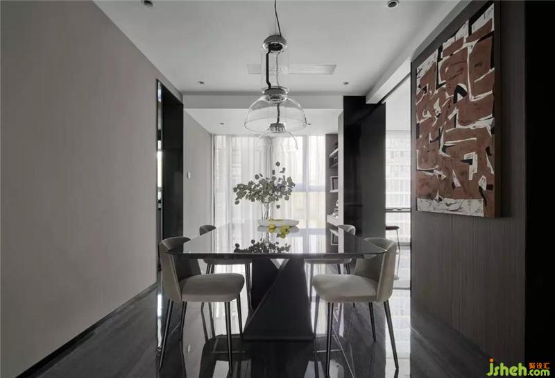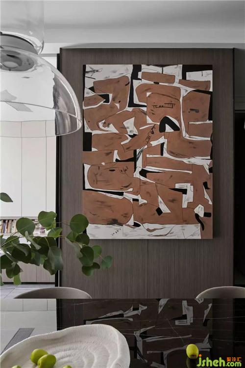 改造后的餐廳空間規(guī)整,南北互通的陽(yáng)光和米色墻面使空間柔和有加,水晶玻璃的餐吊燈和走心的小配飾寓意了主人的美好生活,墻面的抽象裝飾畫(huà),更增添了空間的趣味性。