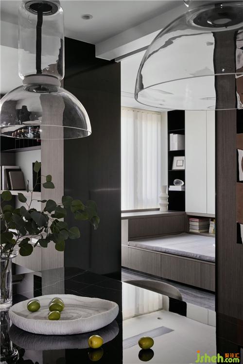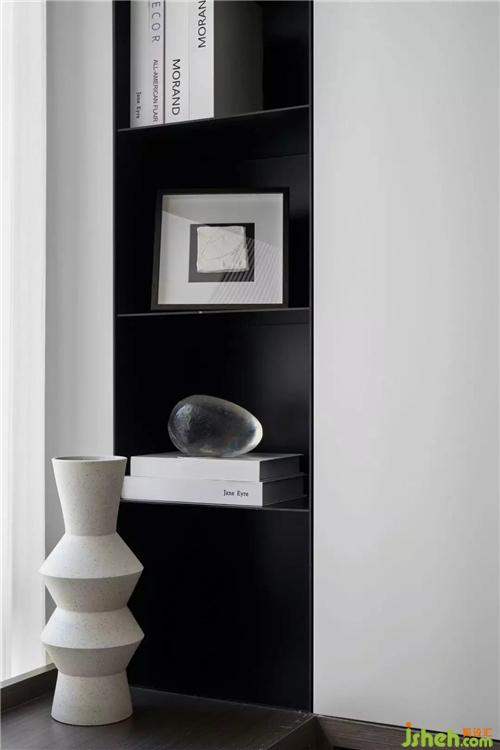 多功能的書(shū)房延續(xù)了客餐廳深色的理石地面和原木灰木飾面,紹興裝修設(shè)計(jì)和書(shū)桌連接處獨(dú)立出一個(gè)黑色開(kāi)放柜構(gòu)建了空間幾何感,酒紅色的單椅和中灰的布藝坐塌,使得整個(gè)空間顯得非常有層次和舒適。