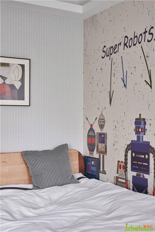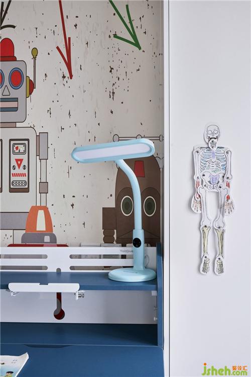 孩童總是對世界充滿著無限的好奇與想象。男孩房在主色調(diào)的基礎(chǔ)上增添了不同維度的淺藍(lán)色用以裝飾,用色彩傳遞情感,充滿未知與想象力。