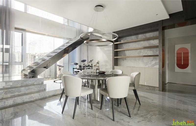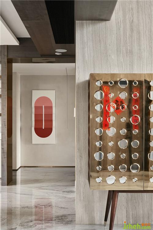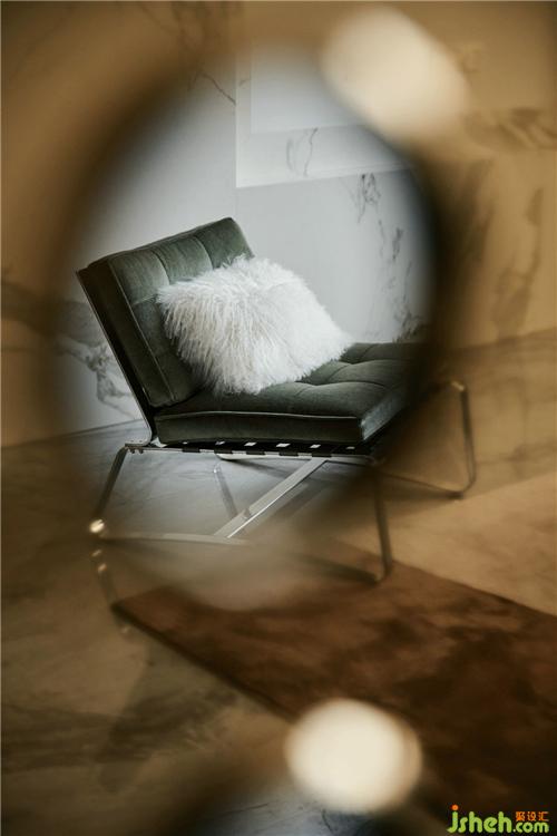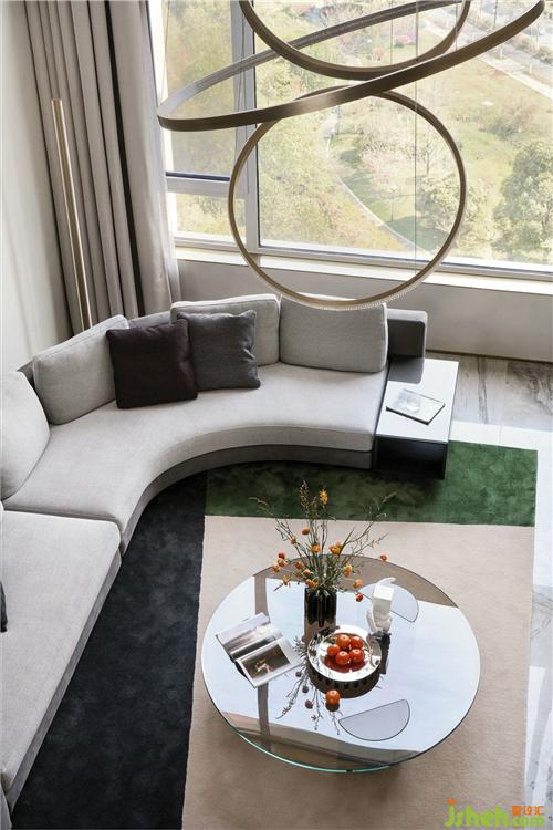 客廳背景的金色藝術(shù)裝飾宛如大自然水滴聚集落下那一瞬間形成的美妙天然狀態(tài),與這套位于錢塘江畔數(shù)百米外的一線江邊景色相互呼應.