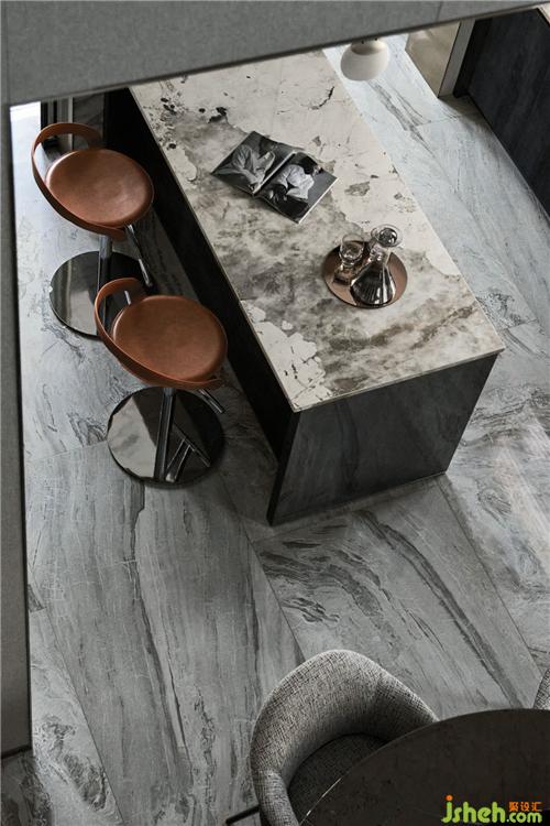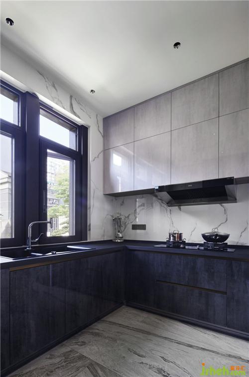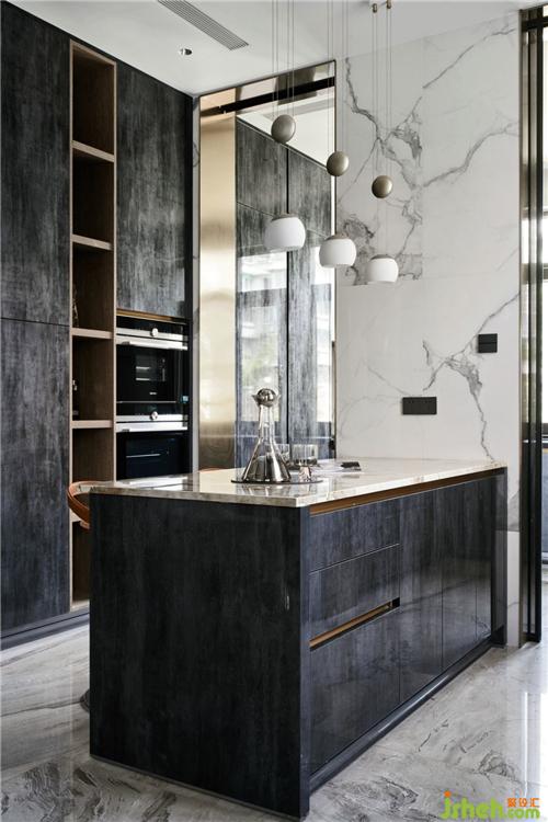 在餐廳與廚房交界處設(shè)計(jì)西廚區(qū)域,島臺(tái)臺(tái)面使用銀狐巖板,蒸烤箱、水吧臺(tái)設(shè)計(jì)在島臺(tái)兩側(cè),考慮到餐廳需要收納儲(chǔ)物,島臺(tái)加入收納功能;