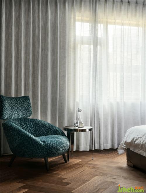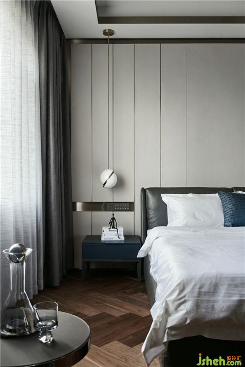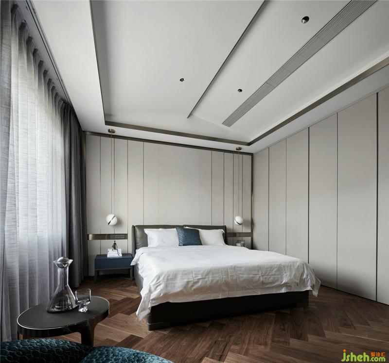 主臥異形吊頂造型主要結(jié)合原始結(jié)構(gòu)中的頂層吊頂,墻面硬包劃分了不規(guī)則的線條,杭州別墅裝飾使用大面積的暖灰色柜門制造留白,低調(diào)卻又奢華的單人椅為整個(gè)空間增添了一絲華麗氣息。