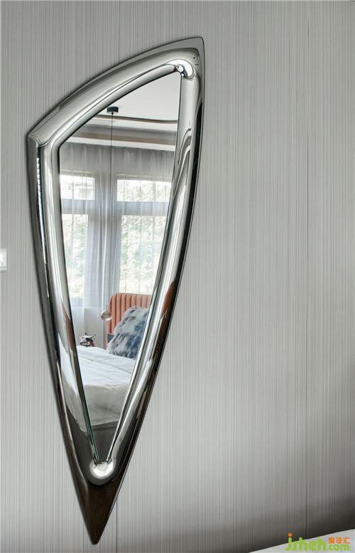 女兒房主色調(diào)為橘色,墻面上使用凹凸感很強(qiáng)的墻紙,搭配上cattelan italia的不規(guī)則鏡子;床背景設(shè)計(jì)現(xiàn)場(chǎng)制作的弧形與軟包搭配,考慮到原始戶型結(jié)構(gòu)為長(zhǎng)方形,則把化妝臺(tái)設(shè)置到床背景后,呈現(xiàn)出整個(gè)女兒房簡(jiǎn)單而奢華的情調(diào)。