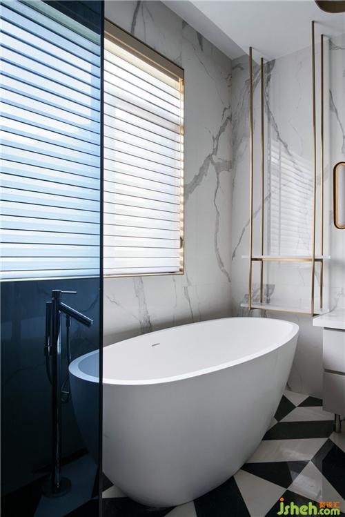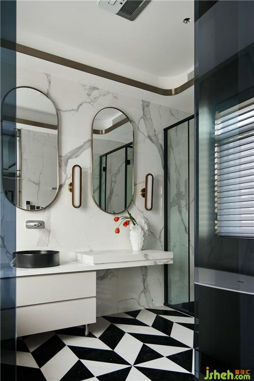 女兒房衛(wèi)生間使用黑白拼接地磚與白色紋理墻磚搭配,通過黑與白的相互交錯(cuò),杭州別墅裝飾可以打造出一種無限延伸的空間感;