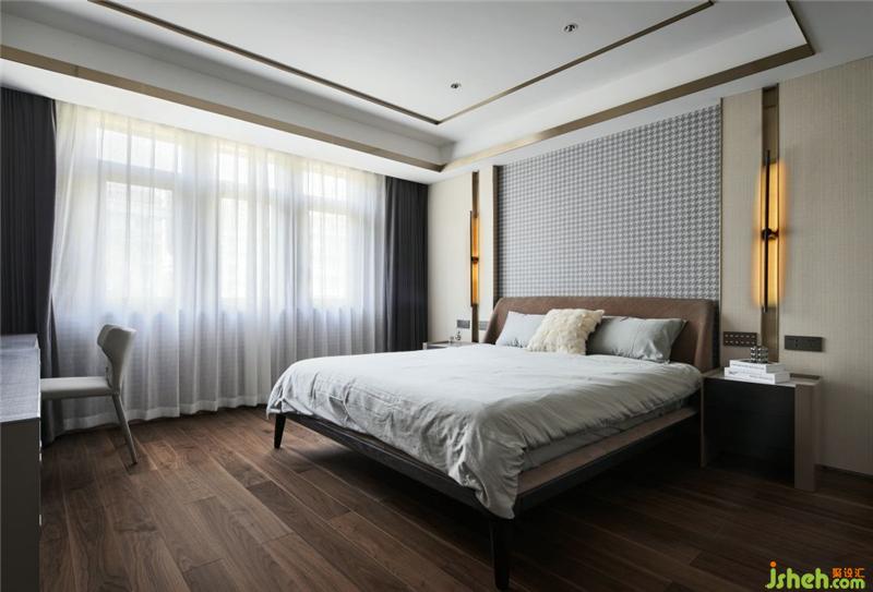 次臥硬裝與軟裝之間的配合十分緊密,墻面打造凹凸質(zhì)感,兩種材質(zhì)貼于墻上,同時(shí)床體尺寸配合墻面尺寸,兩側(cè)加入金屬線條掛壁燈,營(yíng)造整體溫馨氛圍;