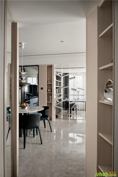書(shū)房與客廳的結(jié)合甚是巧妙,使用玻璃成品金屬架作為兩個(gè)空間之間的隔斷,杭州裝修設(shè)計(jì)既有了空間的分割,同時(shí)也增加了客廳的美觀。