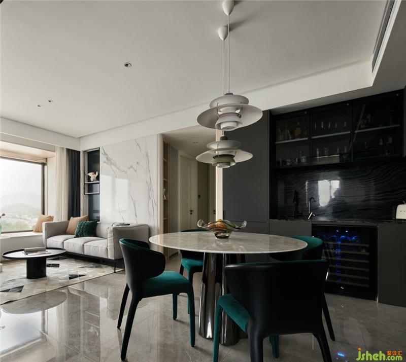 餐廳與客廳處于同一空間,兩者之前的聯(lián)系密不可分,沙發(fā)背景使用了白色大理石,則餐廳制作純黑的櫥柜。杭州裝修設(shè)計(jì)麻雀雖小五臟俱全,根據(jù)業(yè)主需求,紅酒柜、水吧臺(tái)、展示柜等都保留好位置。