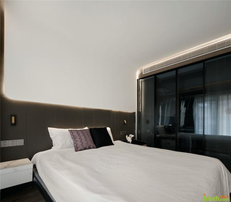 主臥吊頂拋開(kāi)了常規(guī)做法,做了一個(gè)異形延伸到墻面,成為了整個(gè)屋子的亮點(diǎn)。設(shè)計(jì)師根據(jù)原始戶型為主臥留出一個(gè)衣帽間的位置,衣帽間墻體另一側(cè)作為走廊上的儲(chǔ)物空間,物盡其用便是如此吧。