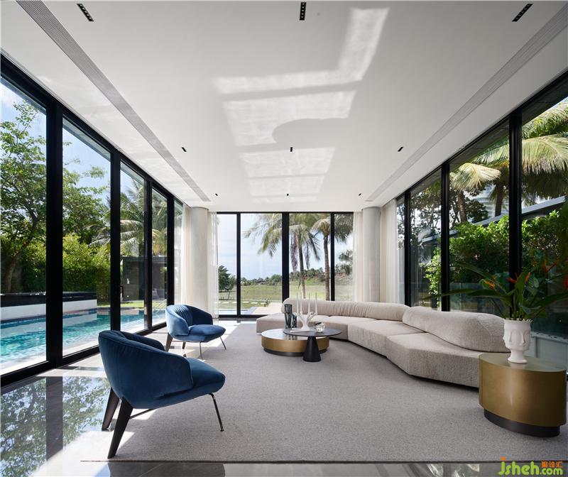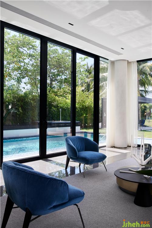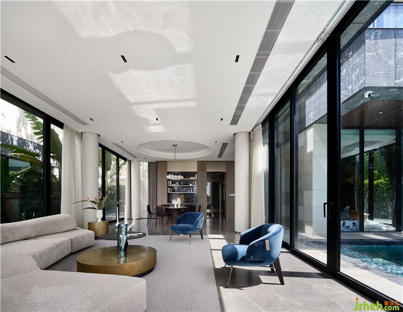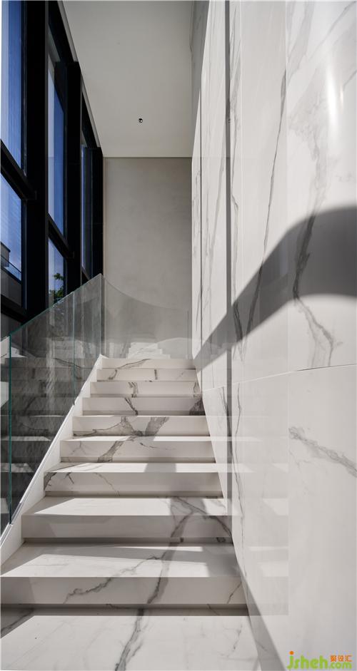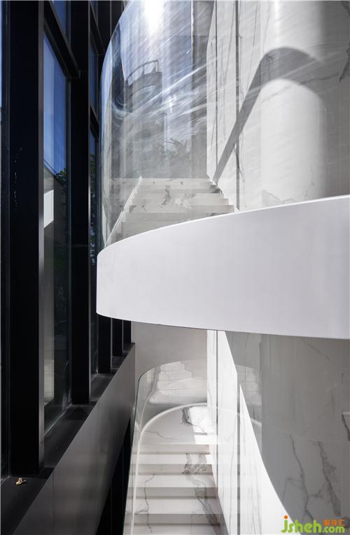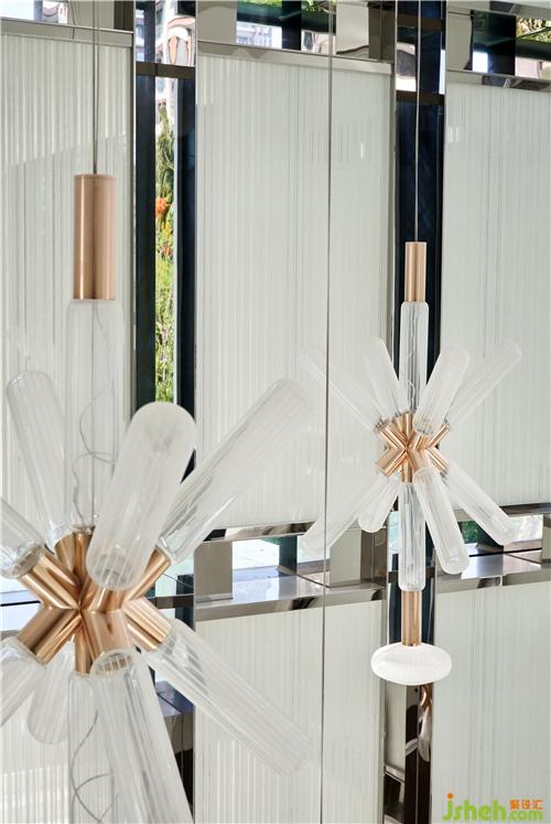 與以往的封閉式玄關(guān)不同,設(shè)計師利用鏡面金屬與鏤空設(shè)計,結(jié)合超高挑空,打造出一個光與影錯綜復(fù)雜的空間。設(shè)計圓弧型吊頂搭配星光式的吊燈,當(dāng)早晨陽光照進玄關(guān),甚至一番美景。
