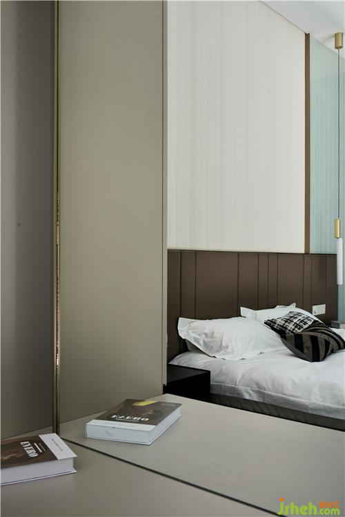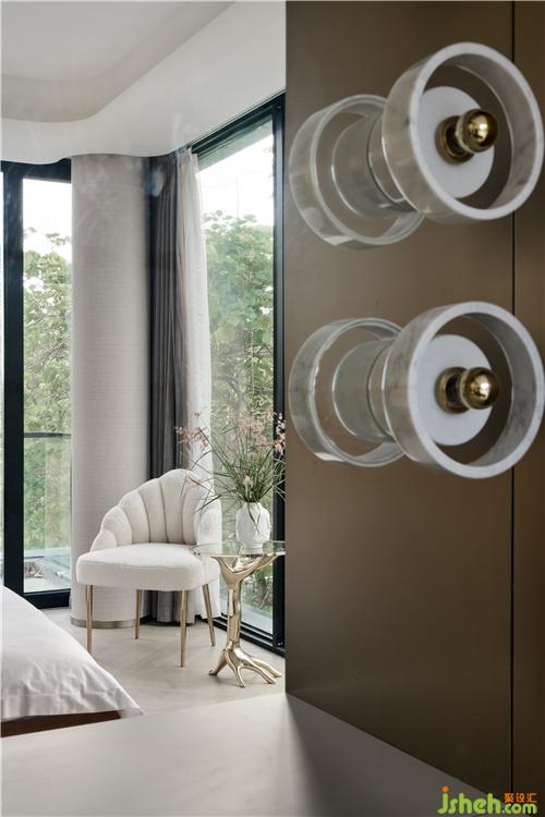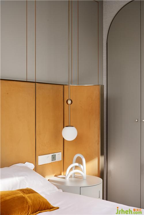 次臥主要打造一個相對活力的臥室,所以使用鮮艷的橙色作為主色調,現場制作的硬包與床架選用同一布藝材質,金屬作為點綴;單人沙發(fā)散發(fā)著優(yōu)雅華貴的氣息,邊幾非常有特色,是兩只手掌組合的形狀。