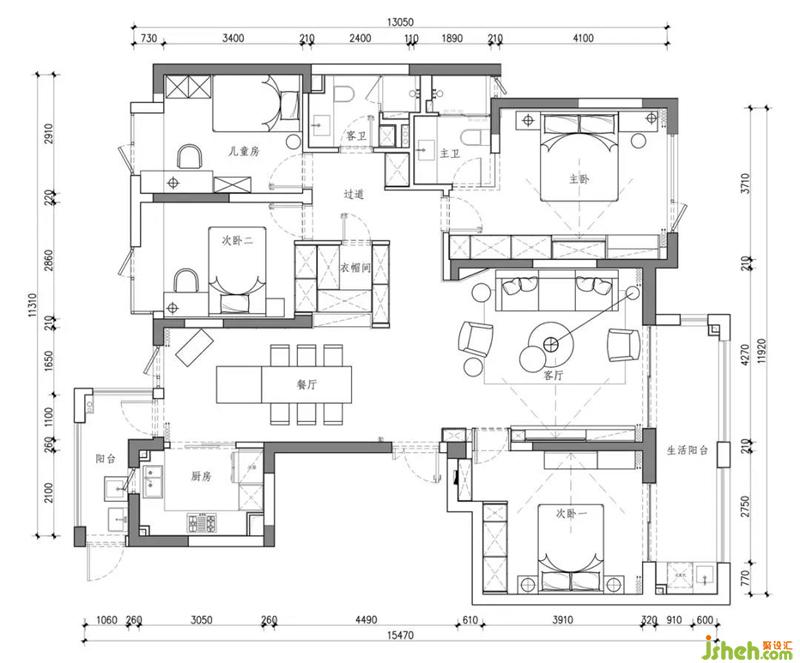 關(guān)于規(guī)劃:設(shè)計(jì)師在一番拆改之后,客餐廳視覺(jué)空間擴(kuò)大,并且變得整齊開(kāi)敞,可以滿足孩子們?cè)谑覂?nèi)奔走玩鬧;休息區(qū)過(guò)道調(diào)整之后,杭州裝修設(shè)計(jì)去往各個(gè)房間的動(dòng)線也清晰起來(lái),互不干擾;共用衣帽間大大增加了家庭的儲(chǔ)物功能,同時(shí)衣帽間位置的調(diào)整,使入戶也變得通透爽朗。