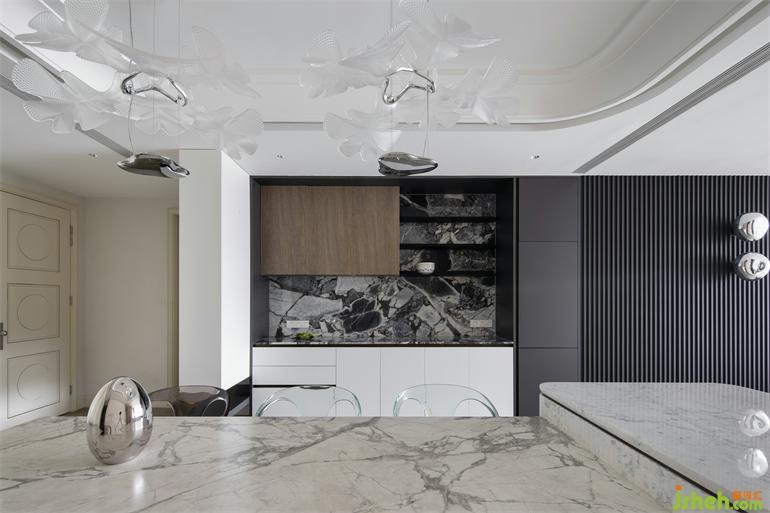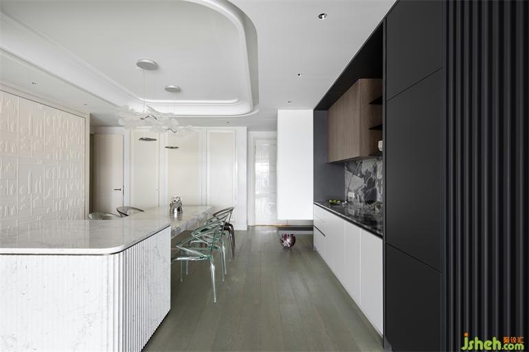 上海豪宅設計改變傳統(tǒng)餐桌形式,島臺與餐桌的結合,同時增加西廚區(qū)域,滿足餐廳多場景使用。