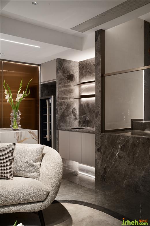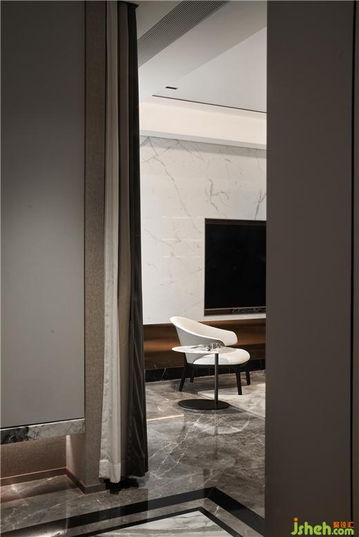 別墅設計在極簡柜體的襯托下,入門的精致大理石紋理已然彰顯不凡氣質(zhì)。半遮掩的客餐廳空間既保留了一定的私密性,卻又引人入勝。一如琵琶行中所訴那般:“轉(zhuǎn)軸撥弦三兩聲,未成曲調(diào)先有情?!?