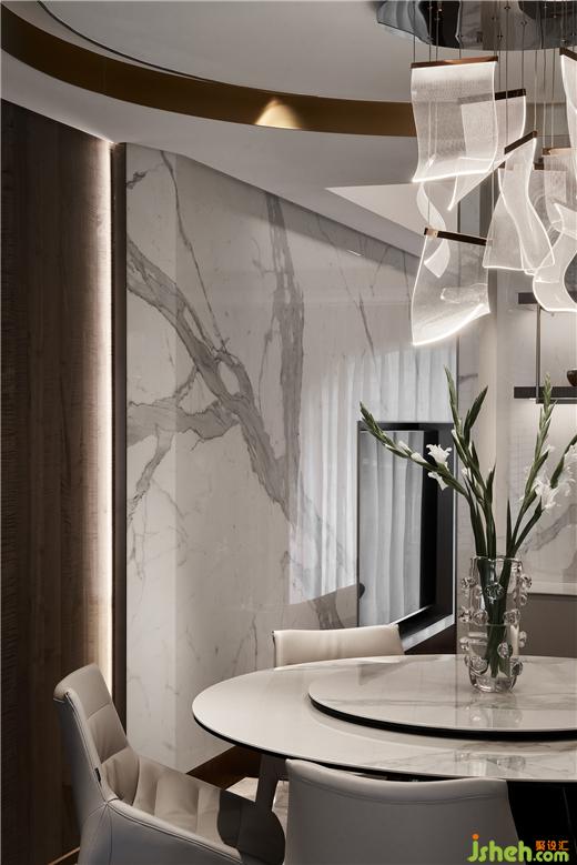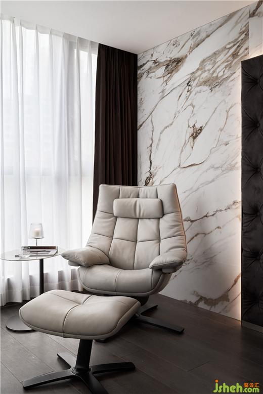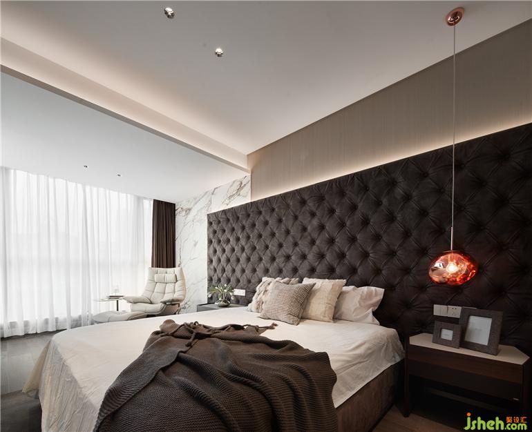 無主燈設(shè)計(jì)已然成為現(xiàn)代居所營造氛圍感的首選,別墅設(shè)計(jì)造型背景及天花四周的隱藏?zé)魩渡涓訉庫o閑適的休憩氛圍。床頭軟包、墻體與大理石分層落錯(cuò),層次分明而相互呼應(yīng),空間立體感油然而生。