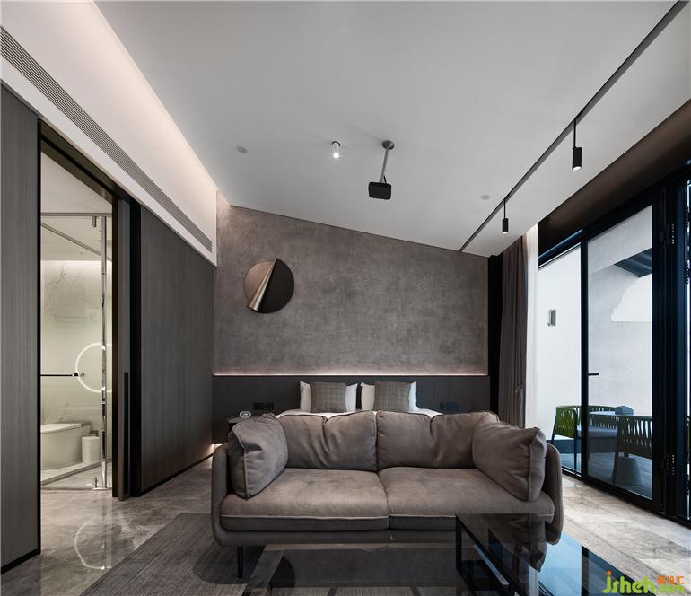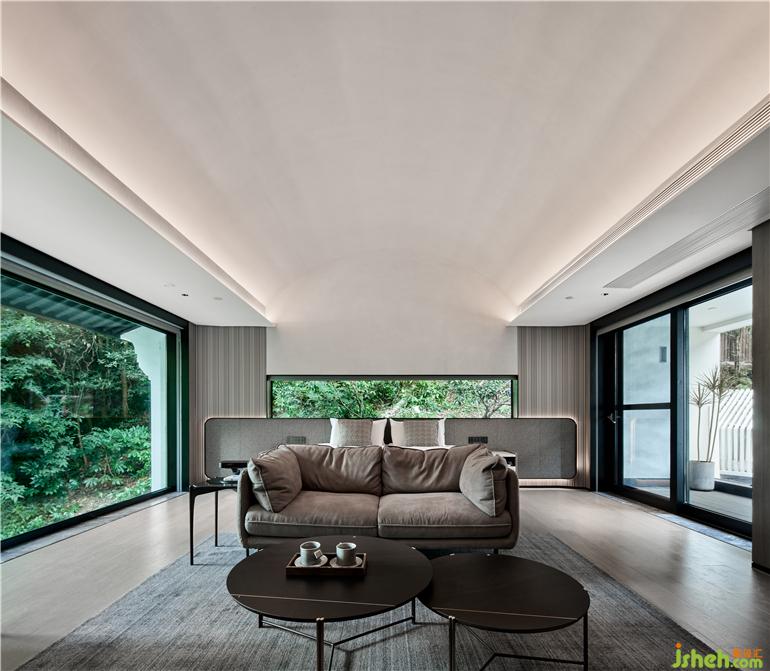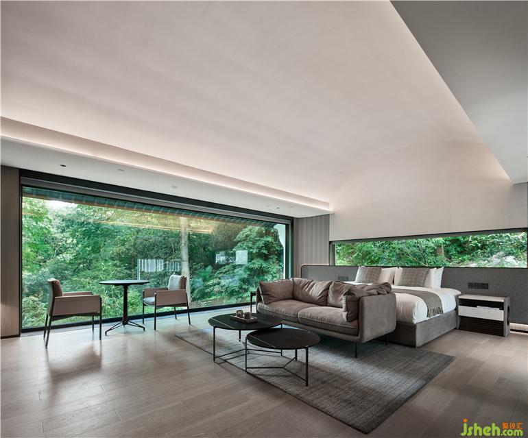 杭州度假酒店設(shè)計(jì)兩面通透的落地玻璃窗,把山林綠意帶來(lái)眼前。