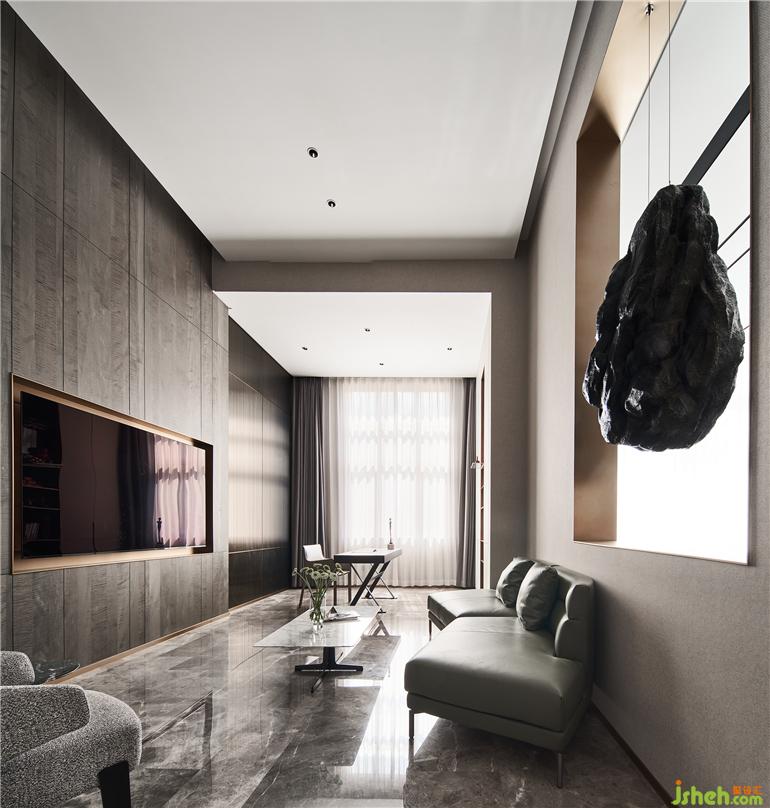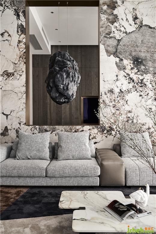 來(lái)自潘多拉的奢石色彩將共享、開(kāi)放的客廳與相對(duì)隱秘的工作區(qū)隔開(kāi),背景墻面的“開(kāi)窗”又使得空間彼此聯(lián)系。