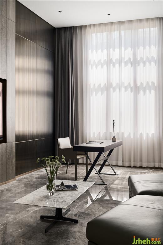 這種類似“取景”的手法創(chuàng)造出可對(duì)話交流的視線,呼應(yīng)的金屬“畫(huà)框”則成為了引導(dǎo)視線的線索?!吧绞睉业踉诋?huà)框中間,杭州綠野春天別墅裝飾設(shè)計(jì)形成一部分的視覺(jué)遮擋,讓窗開(kāi)出更大氣,也更親人的尺度。