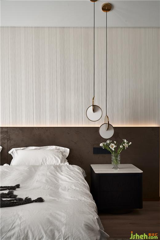 主臥自帶步入式衣帽間與休閑露臺,傾斜的頂面原始結(jié)構(gòu)采用疊級處理,經(jīng)典VESCOM壁紙獨(dú)有的長條肌理為為簡奢的空間營造立體感。