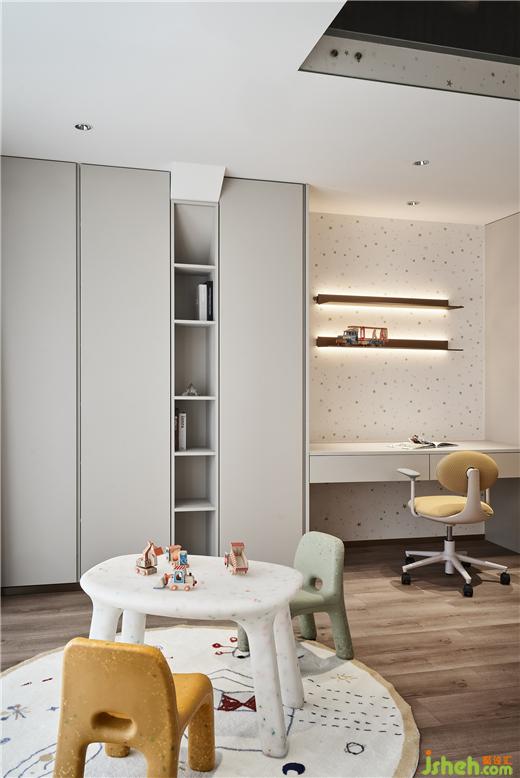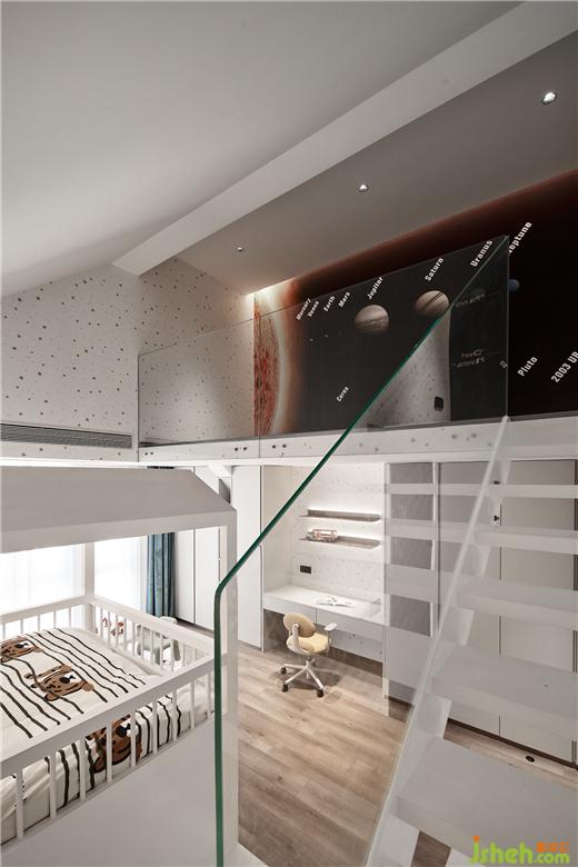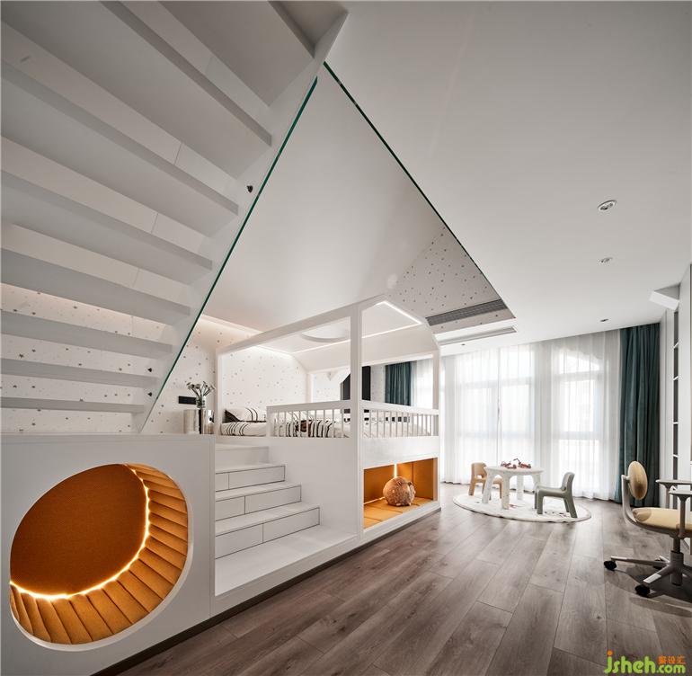 為兩個活潑可愛的孩子定制的互動空間,杭州綠野春天別墅裝飾設(shè)計利用建筑中的坡頂創(chuàng)造出類似閣樓的復(fù)式結(jié)構(gòu),供孩子們自由的躲藏、攀爬、玩耍,伴隨他們一路學(xué)習(xí)成長,度過幸福的童年生活。