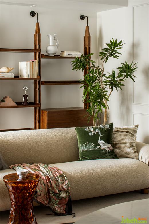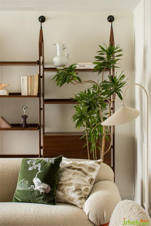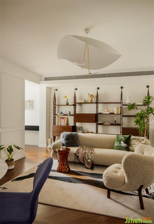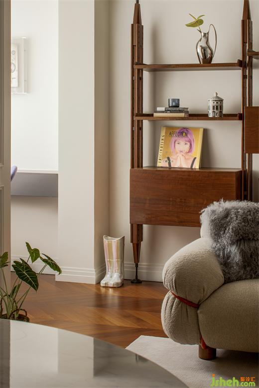 與傳統(tǒng)布局不同,這里沒有所謂電視墻、沙發(fā)墻的概念,空間的每一處都是服務(wù)與居住者的生活狀態(tài)??蛷d中采光最好的地方留給了讀書角:捧一杯茶、一本書,點(diǎn)一盞香薰,都是療愈人心的好物。上海公寓改造設(shè)計(jì)用地毯圍合出客廳的空間,Tacchini的主沙發(fā)大膽的體積和優(yōu)雅精致的設(shè)計(jì)占據(jù)空間C位,橙色的金屬框架是刻意為之,也是設(shè)計(jì)師想表達(dá)的法式浪漫——在平凡中總藏著一些小驚喜。