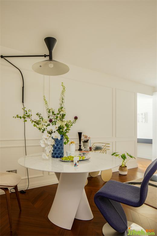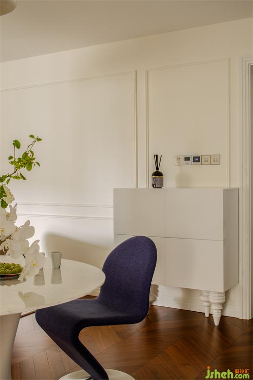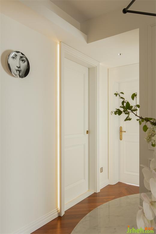 因?yàn)樵冀Y(jié)構(gòu)的局限,硬裝上沒(méi)有做過(guò)多裝飾,墻面簡(jiǎn)單的定制線條營(yíng)造著輕松的法式氣息。定制門(mén)與門(mén)套在傳統(tǒng)法式線條疊加的基礎(chǔ)上,上海公寓改造設(shè)計(jì)摒棄了過(guò)多的弧形元素,采用直線條疊加,既符合空間柔美中又帶有硬朗的氣質(zhì),同時(shí)也表達(dá)了居住者的性格與處世態(tài)度。