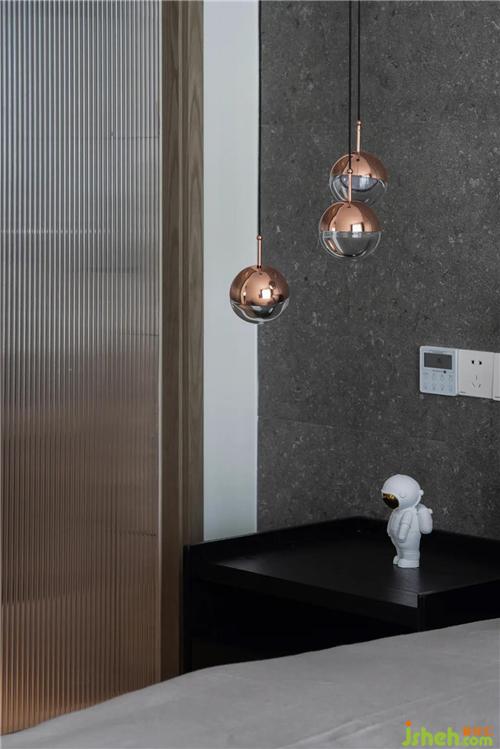 臥室連接內(nèi)外空間材質(zhì),點綴深色木質(zhì)加之石材顯得沉穩(wěn)充滿質(zhì)感