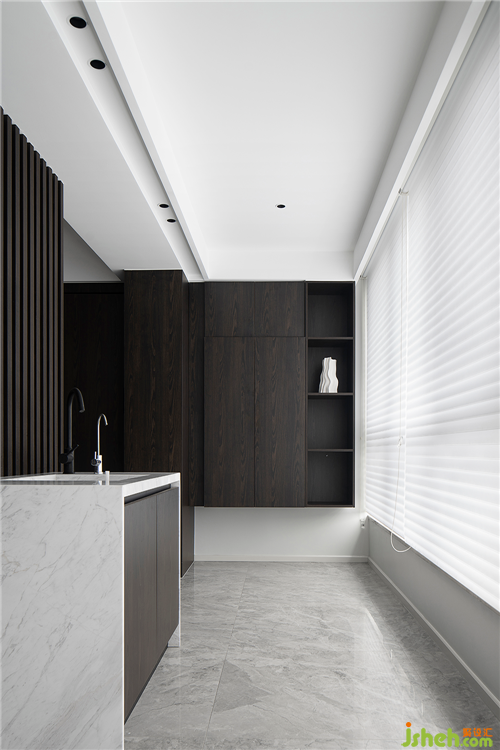在布置方案中,設(shè)計(jì)師首先就要解決的是采光和空氣流通性。讓光線、氣流成為居住者與空間最好的連結(jié),同時(shí)擯棄了繁復(fù)的墻面造型,選擇通過材質(zhì)的對比運(yùn)用豐富空間層次。