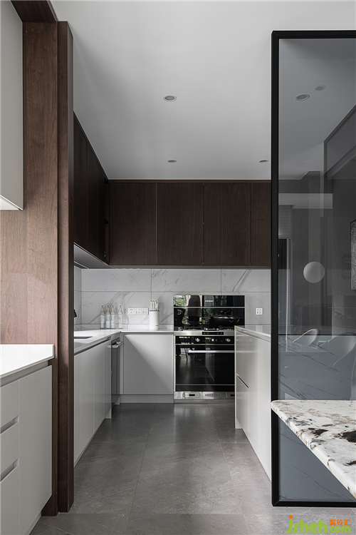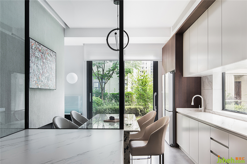 為了給廚房提供一定程度的隱私,又能與公共空間不失聯(lián)系,故在中島設置“L”型玻璃隔斷,以幫助隱藏那些有時不可避免的混亂和雜亂。