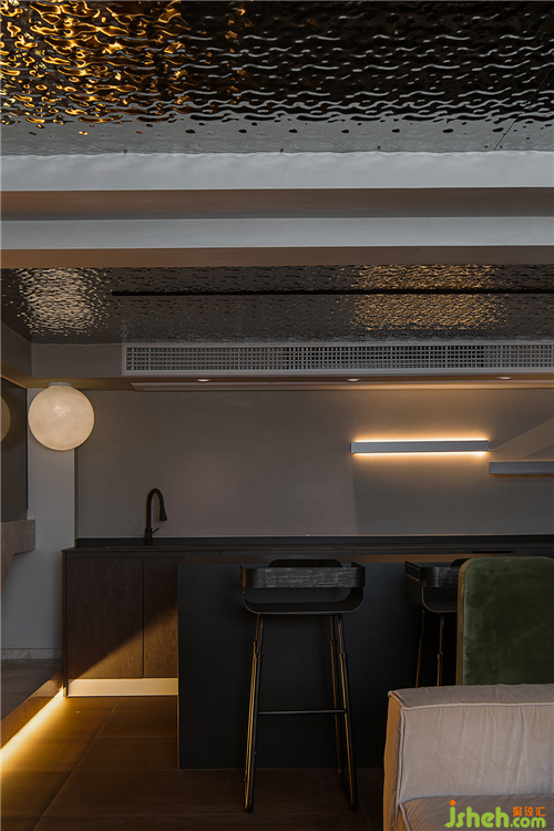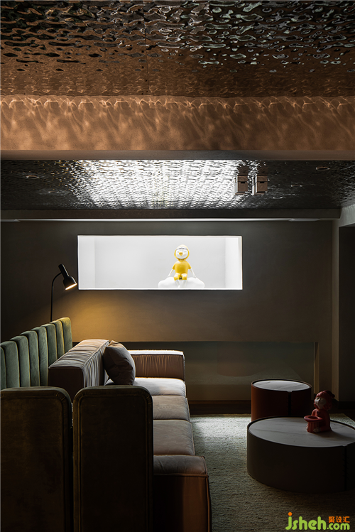 拾級(jí)而下的地下空間,由于層高的限制,空間頂面采用波紋鏡面質(zhì)感,解決了空間壓抑的缺點(diǎn),模糊了空間的界限。