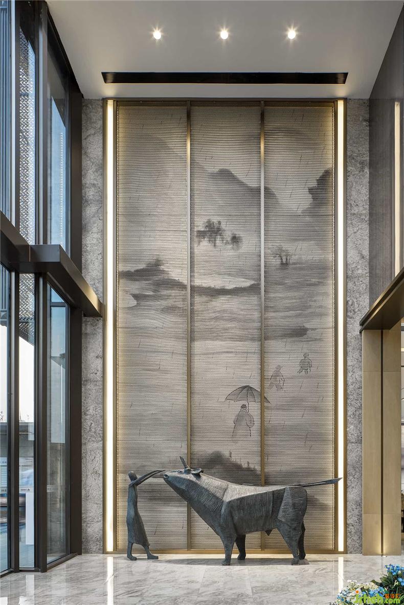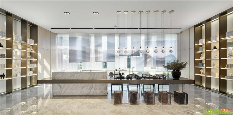 沙盤區(qū)頂部的玻璃紋理使得空間變得飽滿而不壓抑,宛如屋檐,又似“天井”,更像高山中縹緲輕盈的白云,置身天地,當?shù)谩耙挥[眾山小?!庇窒窬d延宛轉(zhuǎn)的江海河流,為所經(jīng)所至之地帶去貫恒千年萬年的福澤。房屋瓦舍,從古至今是人類“家”文明的重要承載物。在這樣的氣勢下,居住者的心境與環(huán)境相影響,也都會變得寬闊宏偉。