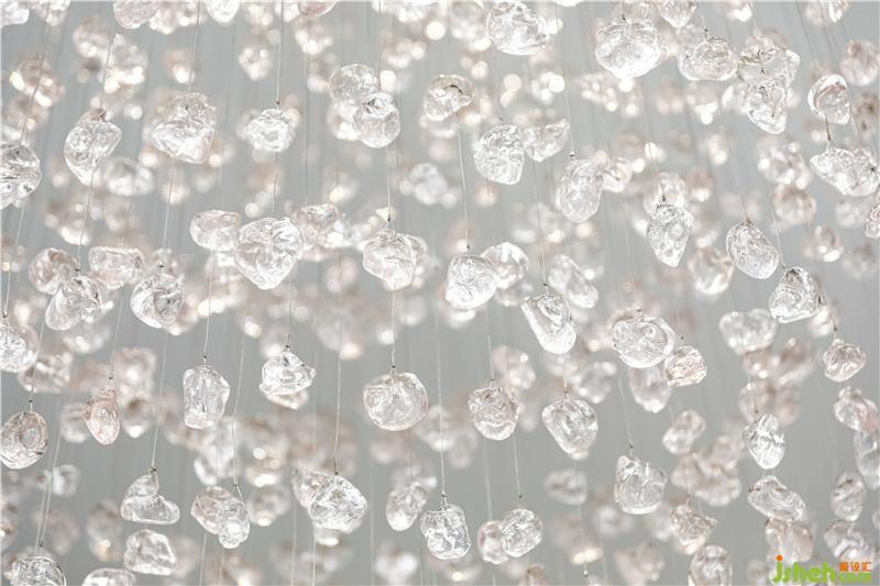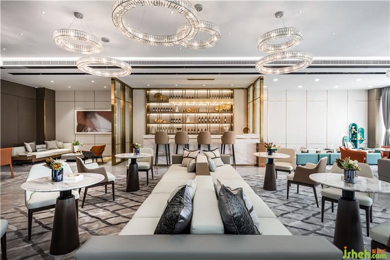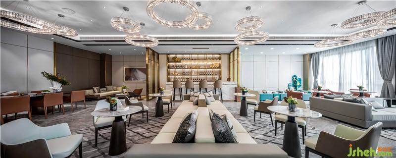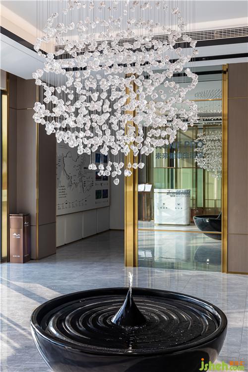 進(jìn)入前廳,首先映入眼簾的便是乍浦的“水”,水滴形狀的不規(guī)則吊燈,跳躍的水珠緩解了縱向線條的單一和緊張,為空間增添了靈動感,與流水裝置的雕塑相互呼應(yīng)——水滴落在水面上,蕩起層層漣漪。