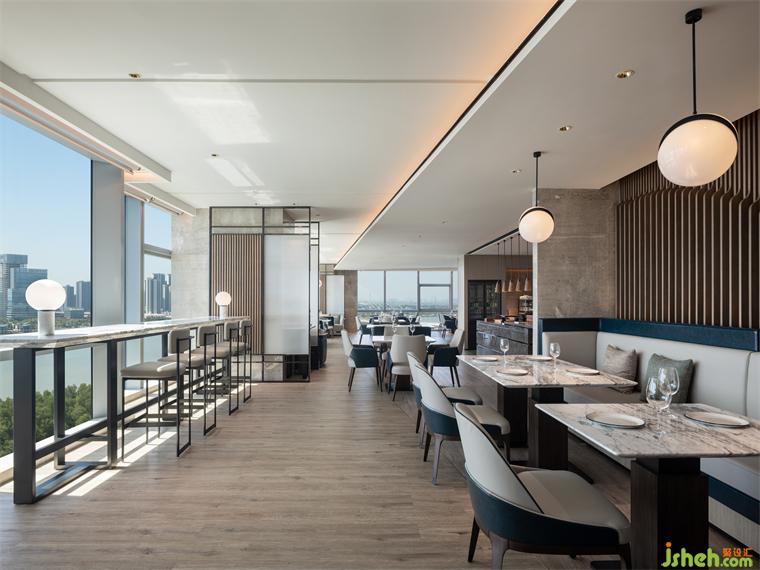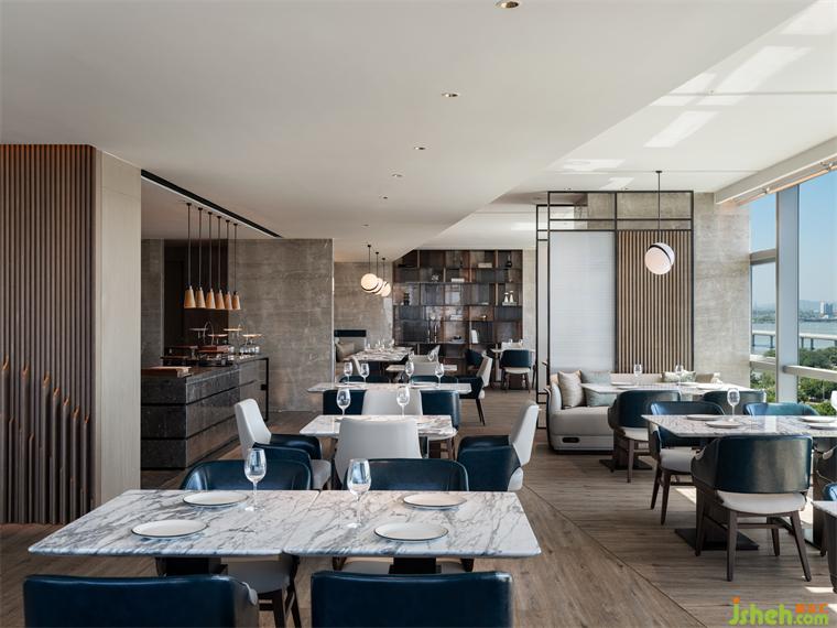 夕陽揮彩,暗香浮動月黃昏,黃昏潮落南沙明,走進行政酒廊,夕陽淡淡地映照在湖面上,泛起波光,暖色的木飾面搭配藍色軟裝家具,細微之處彰顯萬豪的品質與精致,締造美好城市的生活感受。