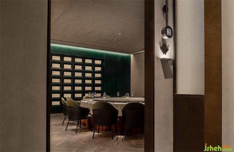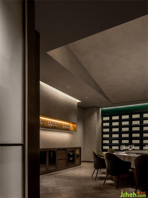 墨綠藝術(shù)墻為框架,晶瑩的玻璃磚為內(nèi)容,既是屏風(fēng),亦是入口。餐廳設(shè)計(jì)沉穩(wěn)的色彩與通透的光影虛實(shí)相依,讓雅致的內(nèi)部空間若隱若現(xiàn),耐人尋味。