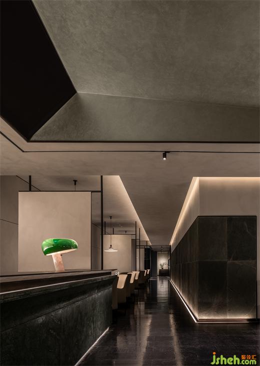 墨綠色從入口延伸至餐廳內(nèi)部,深綠色肌理感大理石搭配溫暖的燈光,空氣中低語著恬靜的音符,讓心靈遠(yuǎn)離塵囂。吧臺的燈飾是一抹翠綠,宛如一顆翡翠,將輕奢而含蓄的氣氛烘托的恰到好處。