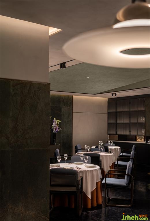 桌椅、地面采用的灰藍(lán)色系的顏色搭配,使得整個空間內(nèi)散發(fā)出一種典雅流暢的氣息。柔和的燈光灑向整個空間,給予圍坐而談的人們充分的私密感與安全感。