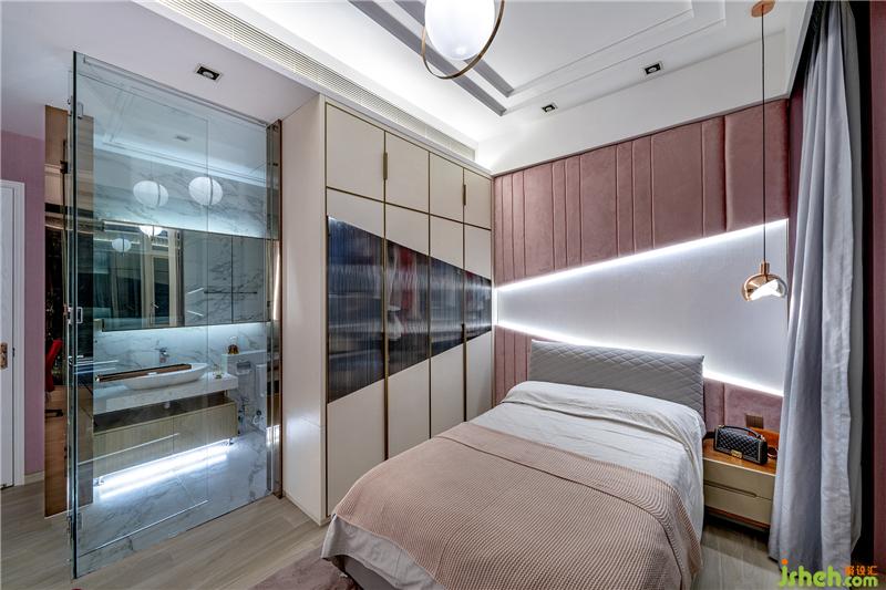 妹妹的房間則以粉紅色和白色為主題色,衣柜和床背的墻身有幾何線條連接,可愛之余增加設(shè)計(jì)感。兩個(gè)房間均用大量云石元素打造套廁。