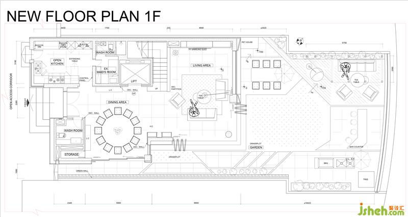 于主人房外的樓梯拾級而上到達天臺,設(shè)計師為維持整個家的一體感,天臺用色和花園十分相似,一樣以石地板配搭綠草和木地臺。不同的是,為響應(yīng)天臺按摩浴池的主題,設(shè)計師將草地鋪蓋成流線形,悠閑有特色。