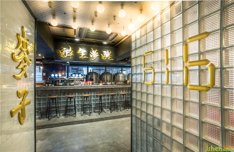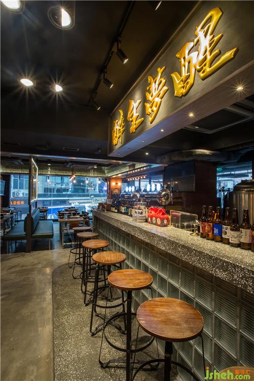 運(yùn)用高低階梯差設(shè)計(jì)將酒吧區(qū)從整體中稍微區(qū)隔開,亮眼的“醉生夢醒”招牌讓這里更添享受當(dāng)下的氛圍。等待時(shí)坐在水磨石吧臺(tái)前,享用釀酒師新鮮釀造的季節(jié)性手工啤酒,讓舒緩的信號(hào)傳遞整個(gè)身體。