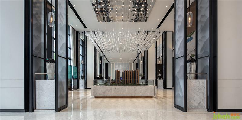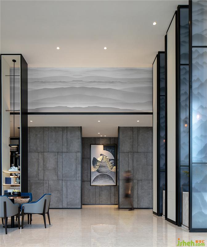 在沙盤(pán)展示區(qū)的上空,清光透亮的水滴型藝術(shù)玻璃吊飾燈,與貫穿整個(gè)空間的山巒水墨畫(huà)相互映襯,宛若一場(chǎng)酣暢淋漓的山雨,洗盡浮世鉛華,滌蕩心靈塵垢。駐足于此,浮想雨后的山林,樹(shù)葉蒼翠無(wú)比,綠草鮮嫩欲滴,漫山素白的玉蘭花,像圣潔的精靈,經(jīng)過(guò)山雨的洗禮,變得更加瑩潔高雅,空氣中夾雜著泥土和花草的清香,心情亦變得舒暢開(kāi)來(lái)……裝修設(shè)計(jì)