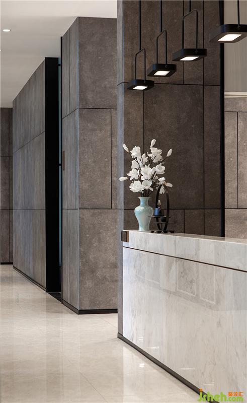 接待區(qū)背景墻是一面巨幅藝術(shù)浮雕,不規(guī)則的線(xiàn)條肌理抽象地呈現(xiàn)出梯形山野田園的意象。雅鉑白大理石,有著山水云霧般的紋理,白潤(rùn)如玉的色澤,給觀者以?xún)?yōu)雅穩(wěn)重、柔和舒適的視覺(jué)感。裝修設(shè)計(jì)