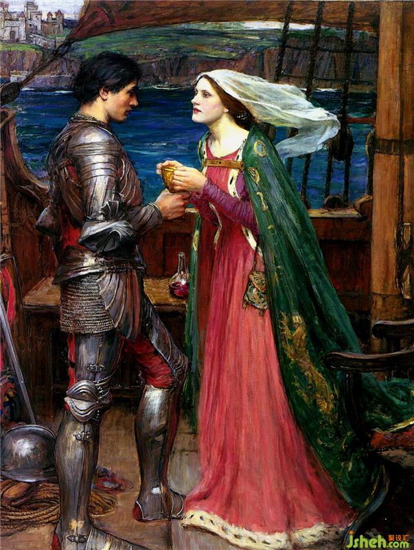 油畫(huà)作品《Tristram and Isolde》以一個(gè)充滿情感張力的靜態(tài)場(chǎng)面講述了亞瑟王傳說(shuō)中的愛(ài)情故事:愛(ài)爾蘭王的女兒在出嫁的船上和崔斯特瑞姆無(wú)意中分享了同一杯酒,相互凝視,立刻在瞬間相愛(ài)。畫(huà)家沃特豪斯一絲不茍地描畫(huà)了公主飛揚(yáng)的面紗、騎士盔甲、船木和遠(yuǎn)方康沃爾郡的海景,用精確的畫(huà)筆使中世紀(jì)的浪漫場(chǎng)景在現(xiàn)實(shí)中復(fù)活。會(huì)所設(shè)計(jì)