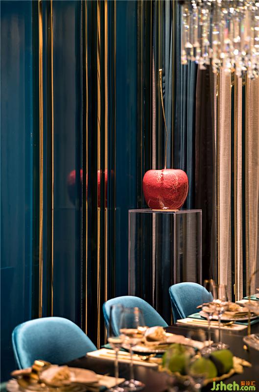 整個(gè)會(huì)所空間以藍(lán)、金主色調(diào)為主,出挑的造型設(shè)計(jì)精心演繹著當(dāng)代的輕奢時(shí)代生活。在整體深色基調(diào)中通過(guò)細(xì)膩的質(zhì)感和色彩上的對(duì)比,玻璃與金屬的運(yùn)用,表現(xiàn)出空間的品質(zhì)感。空間嚴(yán)謹(jǐn)?shù)闹剖?,地面古堡灰大理石,加入濃烈大膽的美人蕉橙和?nèi)斂的搪瓷藍(lán)沖突碰撞,營(yíng)造極致的視覺(jué)體驗(yàn)和極具張力的空間感受,如葡萄酒般濃烈、熱情、優(yōu)雅、浪漫、精致、排場(chǎng),生動(dòng)巧妙地并置。而藝術(shù)畫(huà)的點(diǎn)綴更進(jìn)一步增強(qiáng)了空間的時(shí)尚感與藝術(shù)感。會(huì)所設(shè)計(jì)
